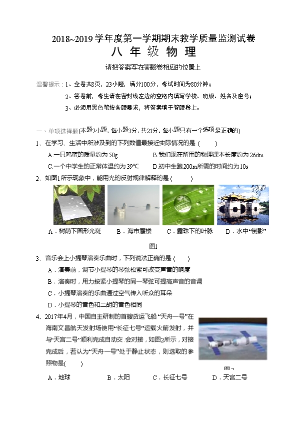 广东省汕头市龙湖区2018-2019学年八年级上学期期末质量测试物理试题及答案