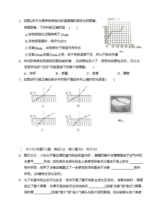 7、如图4所示能正确反映水中的筷子看起来向上偏折的光路是( )