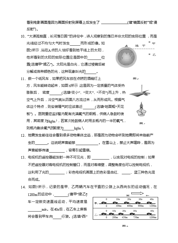 10、“大漠孤烟直,长河落日圆”的诗句中,诗人观察到的落日并非太阳的实际位置,而是光线经过不均匀大气时发生______而形成的像。如图5所示,站在A点的人恰好看到地平线上的太阳,他所看到的太阳的实际位置应是图中的________位置(选填“甲”或“乙”)。太阳光是白光,它通过棱镜后被分解成各种颜色的光,这种现象叫光的_______。