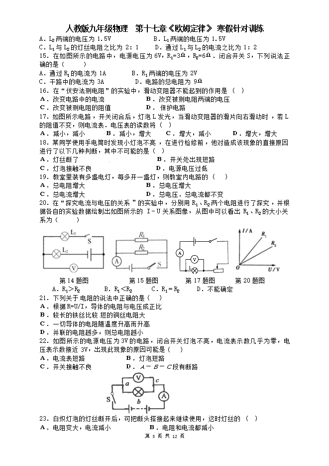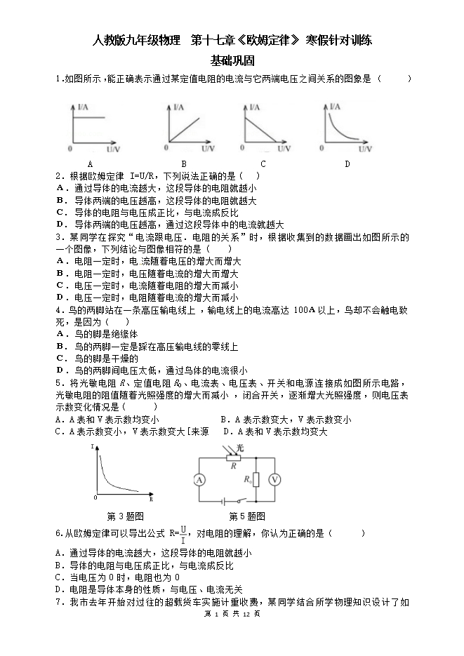 人教版九年级物理寒假针对训练:第十七章《欧姆定律》(基础巩固和拓展提高,附答案)