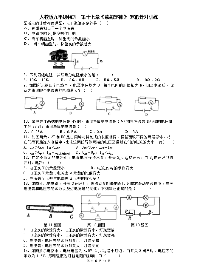 7.我市去年开始对过往的超载货车实施计重收费,某同学结合所学物理知识设计了如图所示的计重秤原理图,以下说法正确的是( )