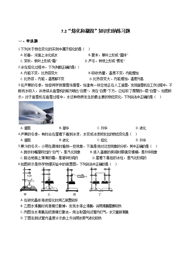 北京课改版八年级物理全册:7.2“熔化和凝固”知识归纳练习题(无答案)