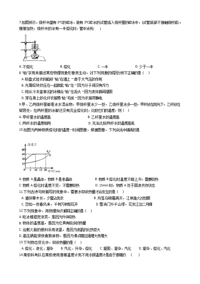 7.如图所示,烧杯中盛有0℃的碎冰,装有0℃碎冰的试管插入烧杯里的碎冰中,(试管底部不接触烧杯底),缓缓加热,烧杯中的冰有一半熔化时,管中冰将( )