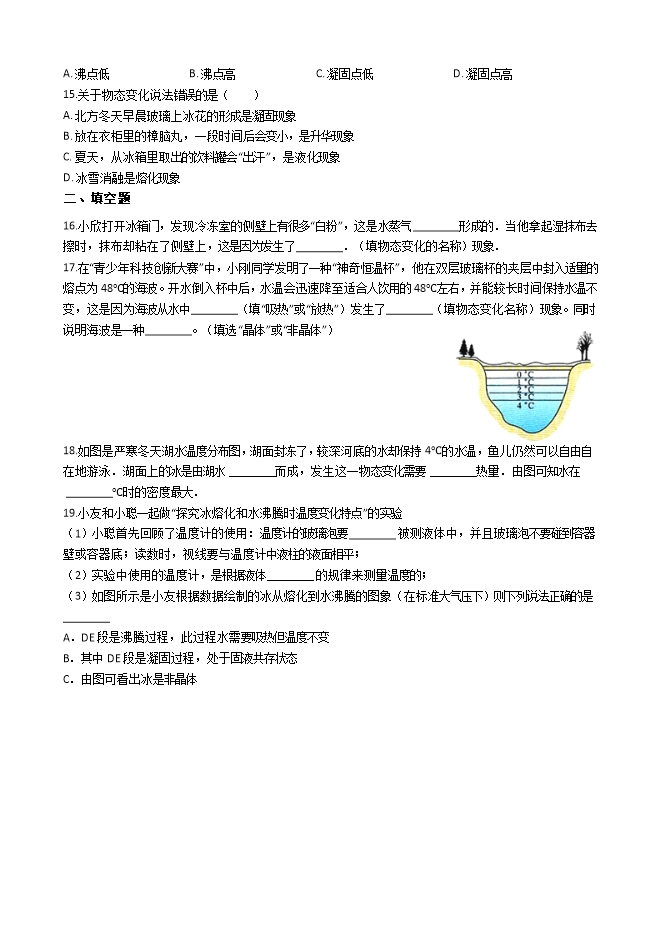 14.南极科考队在南极使用酒精温度计而不用水银温度计是由于酒精的 ( )