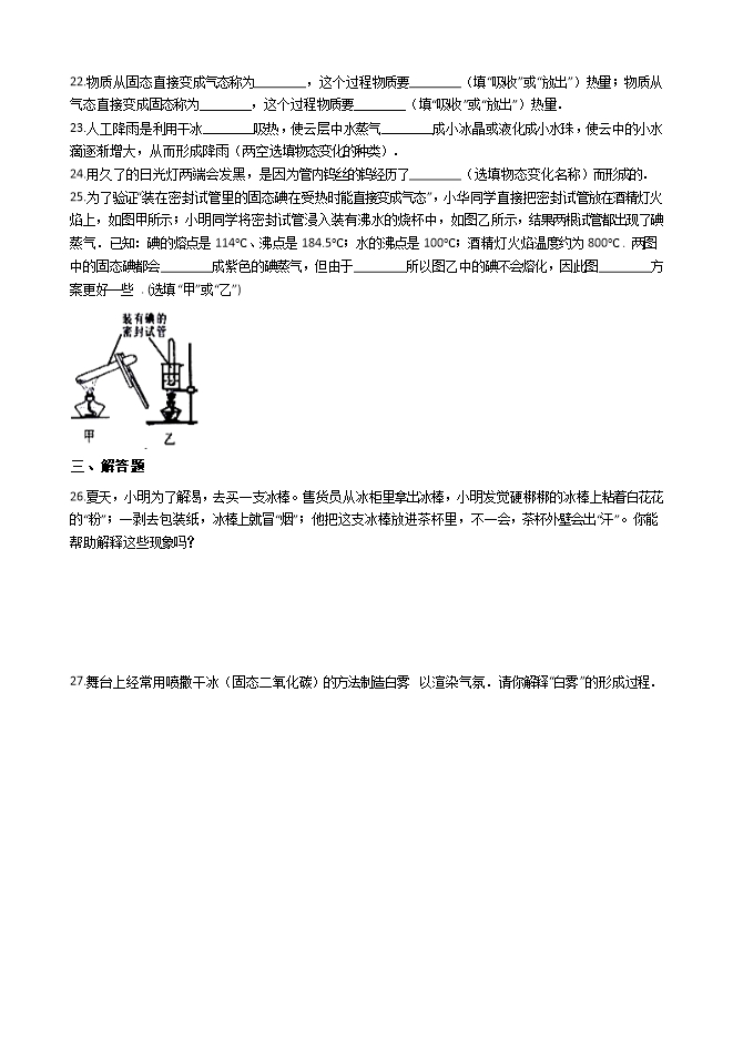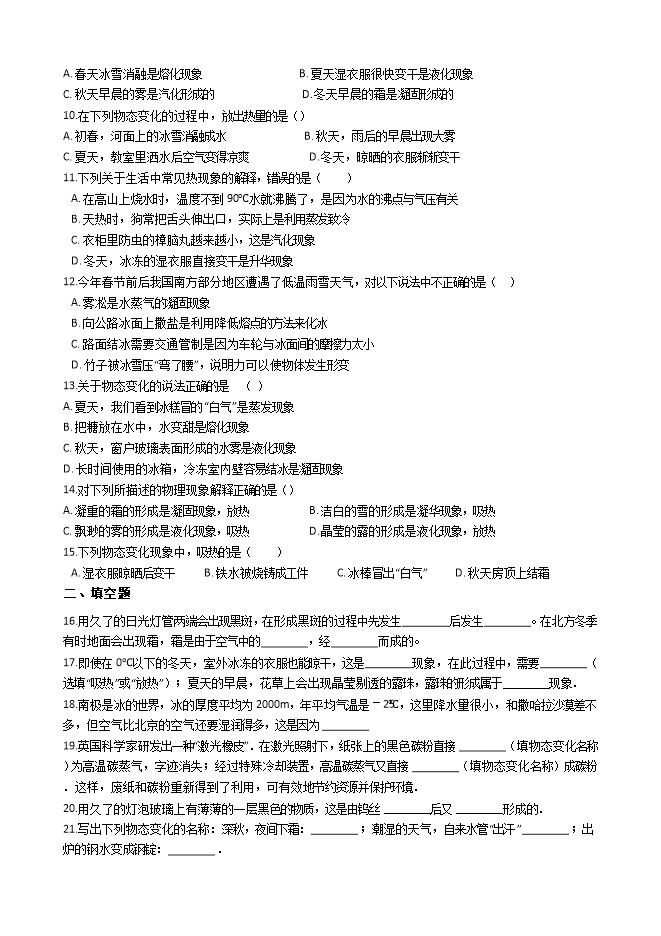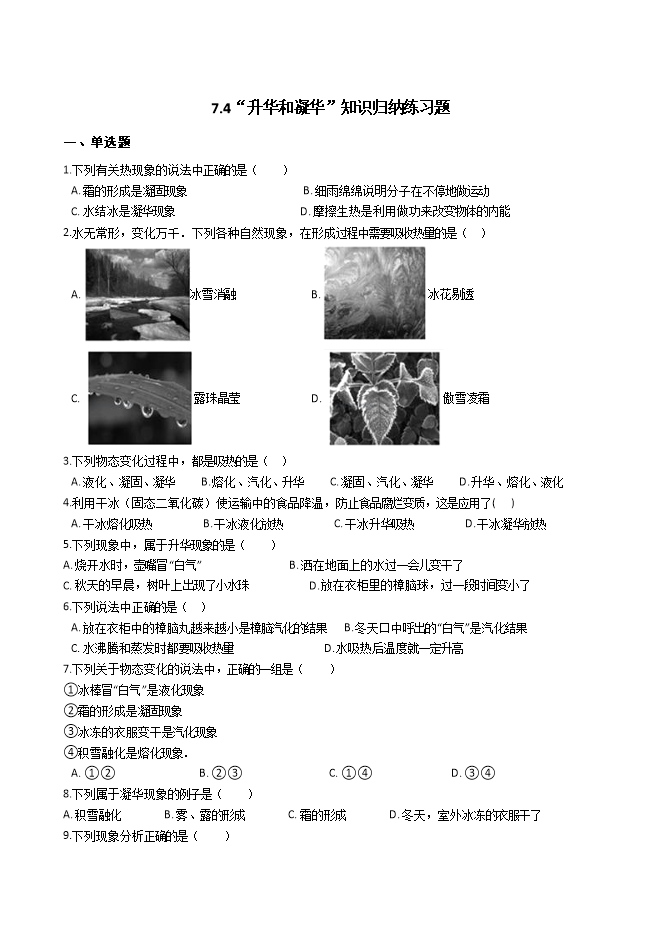 北京课改版八年级物理全册:7.4“升华和凝华”知识归纳练习题(无答案)