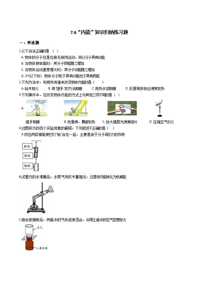 北京课改版八年级物理全册:7.6“内能”知识归纳练习题(无答案)