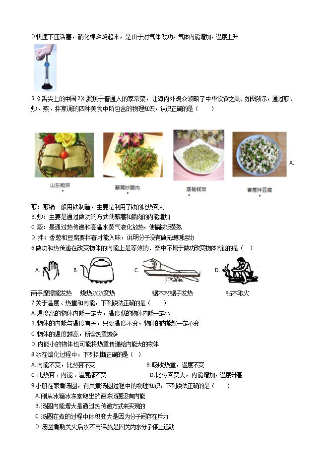 9.小册在家煮汤圆,有关煮汤圆过程中的物理知识,下列说法正确的是( )