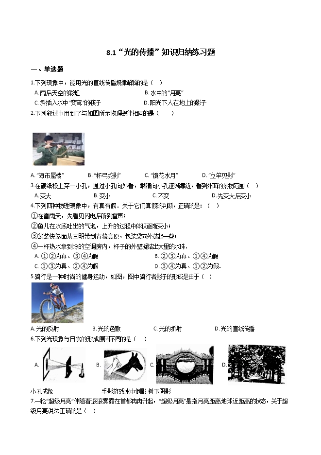 北京课改版八年级物理全册:8.1“光的传播”知识归纳练习题(无答案)