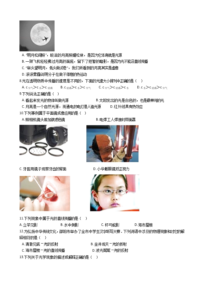 8.光在透明物质中传播的速度是不同的,下面的光速大小排列中正确的是( )