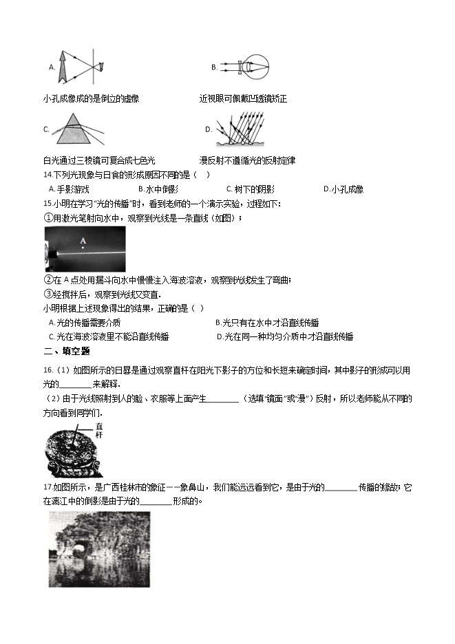 15.小明在学习“光的传播”时,看到老师的一个演示实验,过程如下: