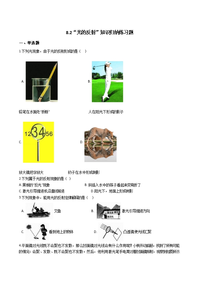 北京课改版八年级物理全册:8.2“光的反射”知识归纳练习题(无答案)