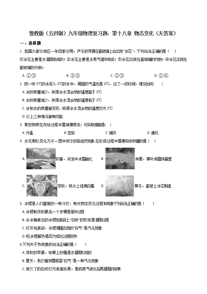 鲁教版(五四制)九年级物理复习题:第十八章 物态变化(无答案)