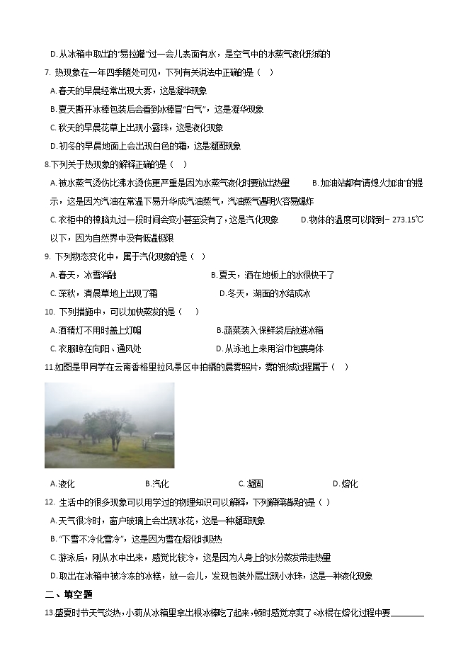 11.如图是甲同学在云南香格里拉风景区中拍摄的晨雾照片,雾的形成过程属于( )