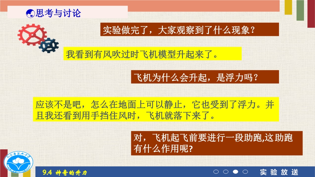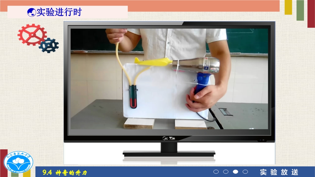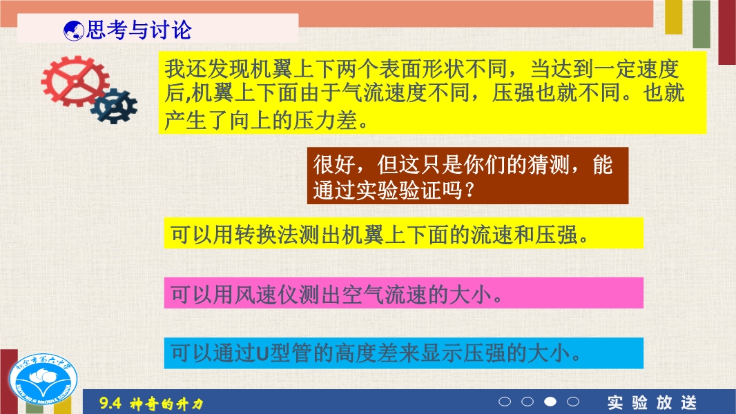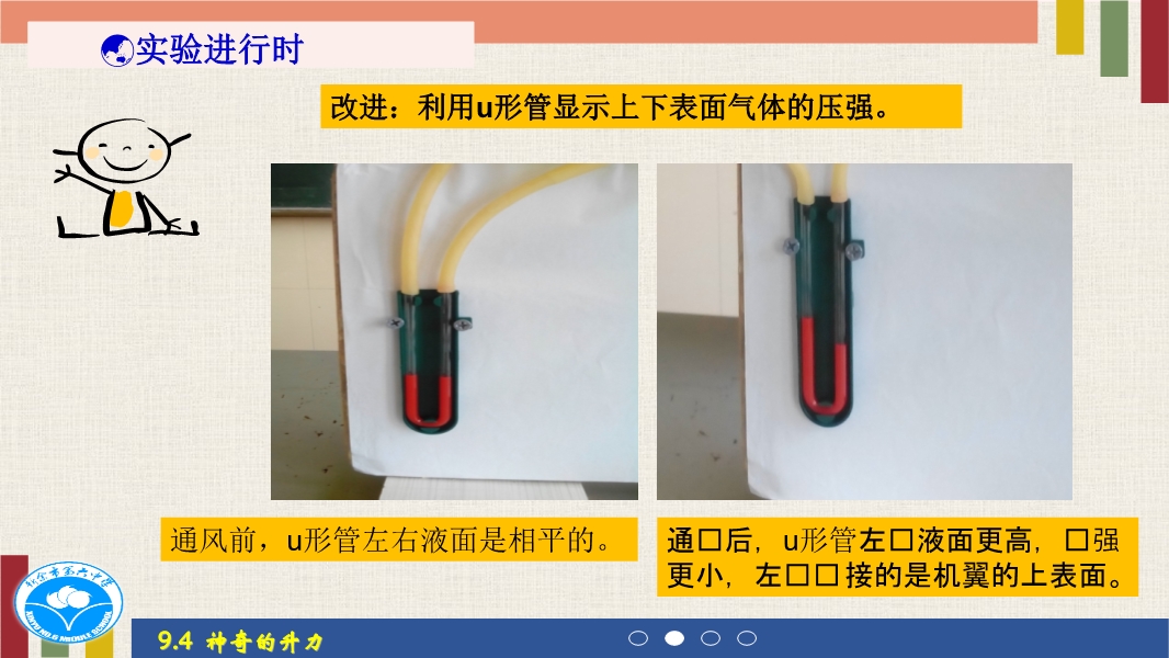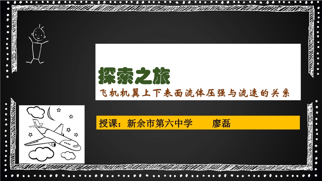 【内容简介】新余市第六中学:人教版:《9.4流体压强与流速的关系》PPT课件,共有14张幻灯片,课件通过展示和引导学生做实验探究了气体压强与流速的关系,课件设计了许多展示了流体压强有关的小实验,也可让学生进行操作。同时引导学生充分认识了升力的产生原因。