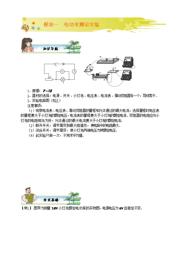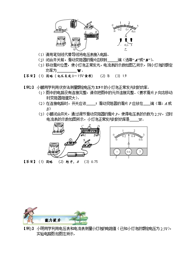 【例2】 小鹏同学利用伏安法测量额定电压为V的小灯泡正常发光时的功率.