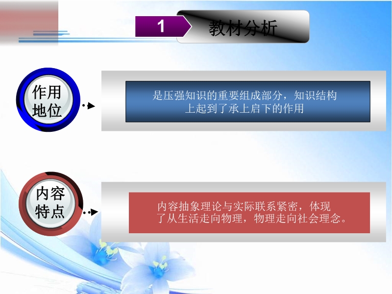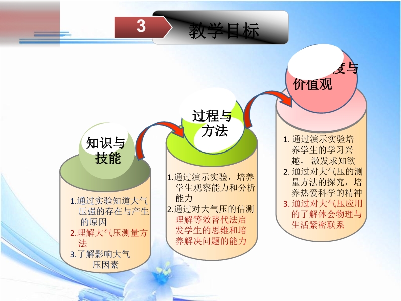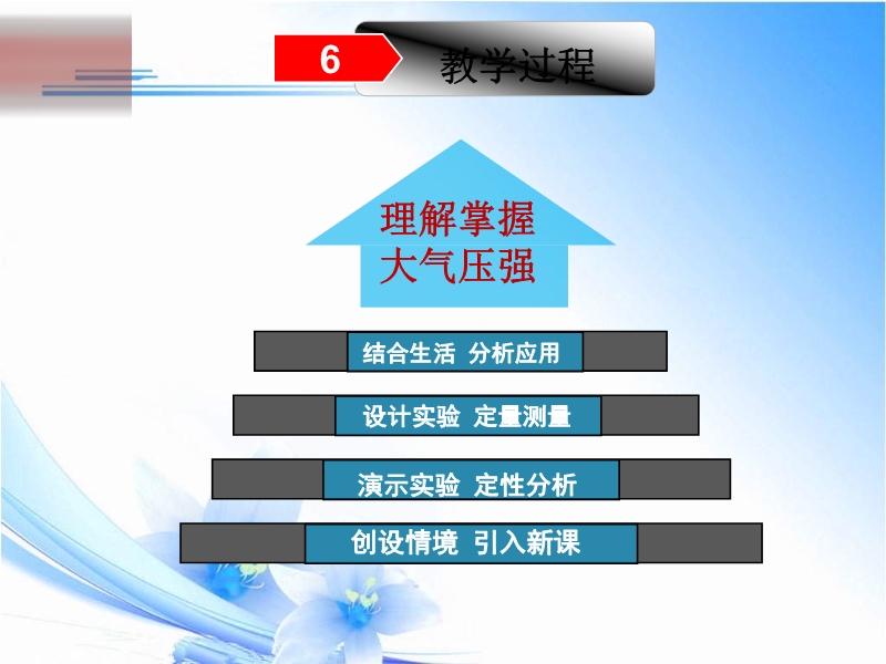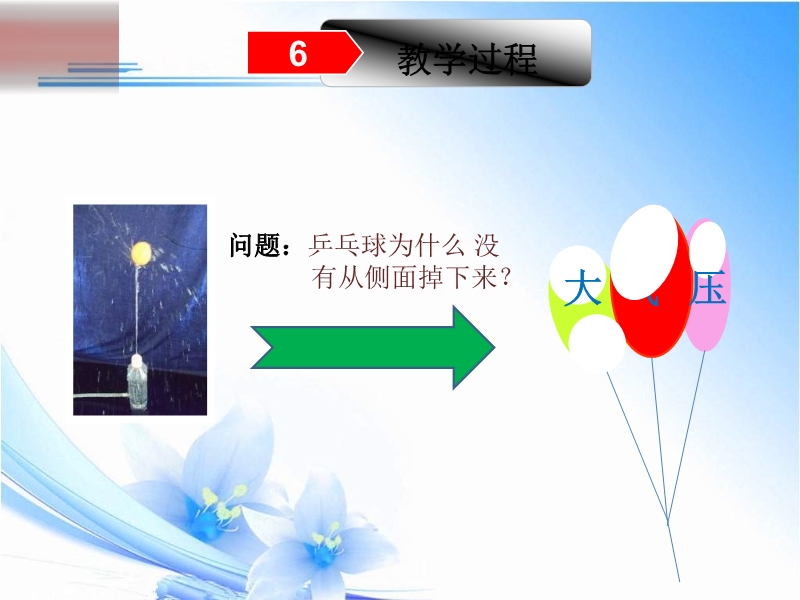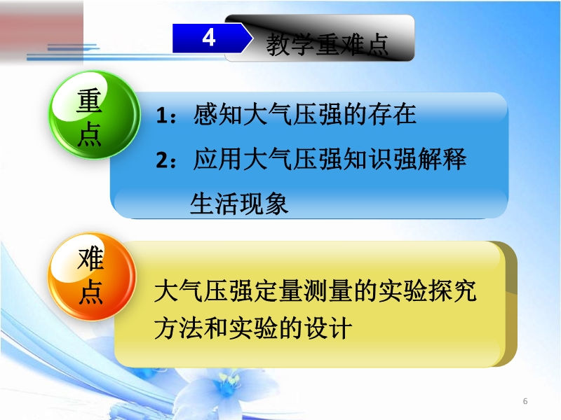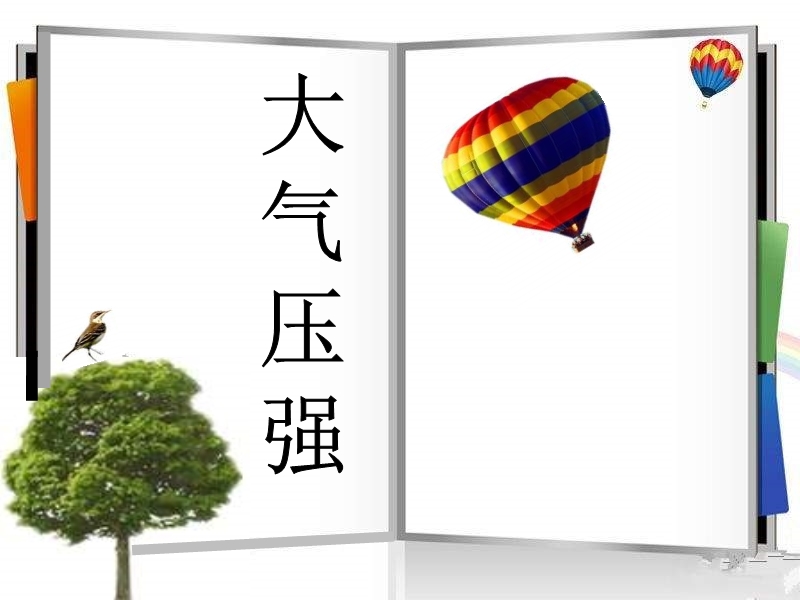 【内容简介】人教版说课课件:《9.3大气压强》PPT,共有19张幻灯片。课件主要分析了本节教材的特点、教学目标、教材的重难点、教学设计思路、教具等,并详细展示了教学设计的过程。