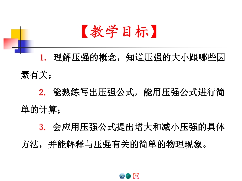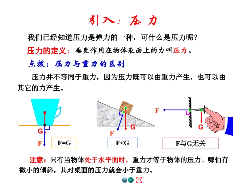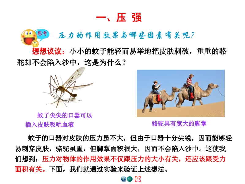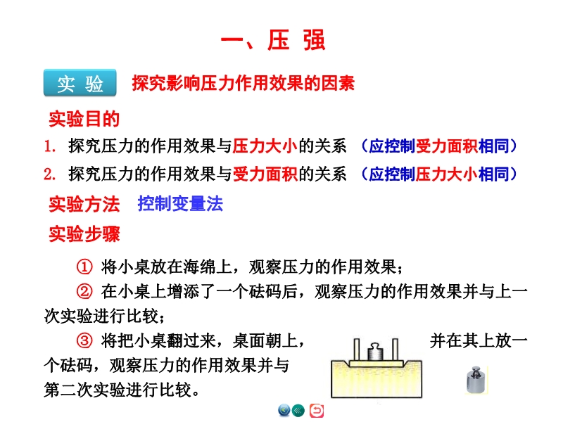 【内容简介】四川广安浓溪初中:人教版《9.1压强》PPT课件,共有24张幻灯片。课件引导学生认识了压力,并引导学生探究了压力的作用效果与压力的大小和受力面积的关系,在此基础上,引导学生认识了压强的意义,学习了压强的计算及压强的单位,讨论了如何增大减小压强等.