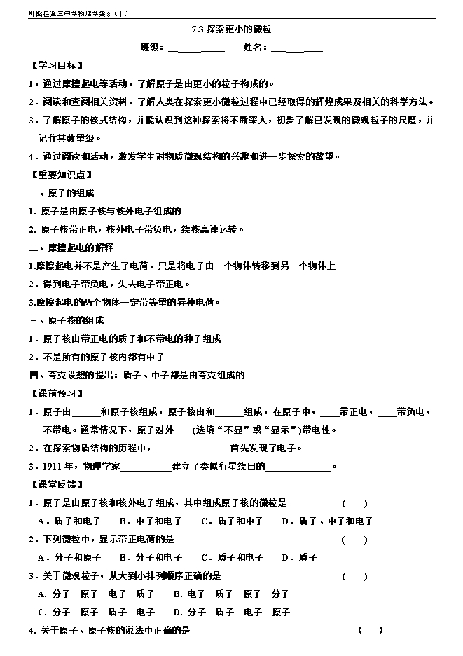 - 722020-2021学年苏科版八年级物理下册课课练:7.3探索更小的微粒(附答案)