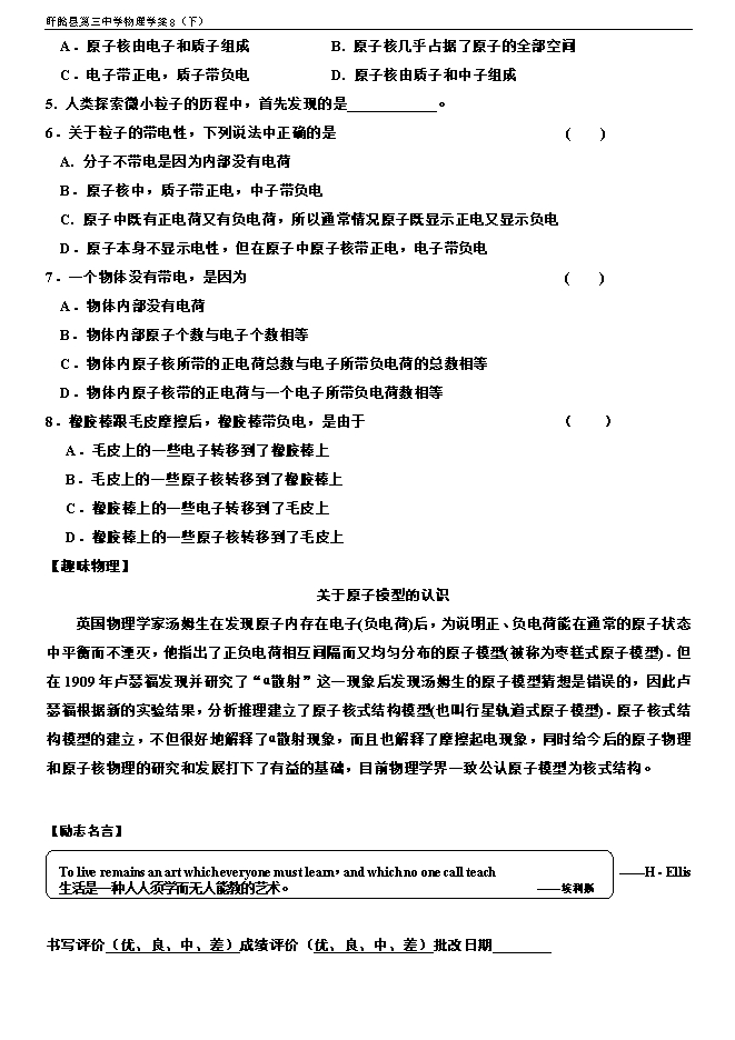 - 621[精品]2019-2020春苏科版物理八年级下册基础与强化必刷题:7.3探索更小的微粒 7.4宇宙探秘(原…