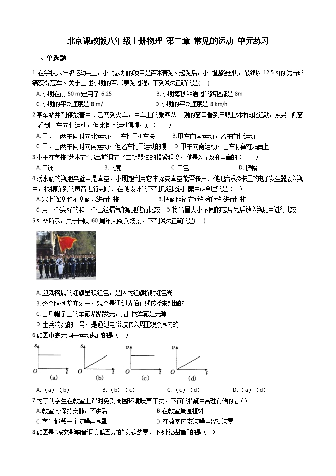 北京课改版八年级上册物理《第二章 常见的运动》单元练习试题及答案