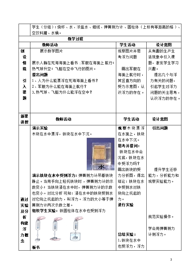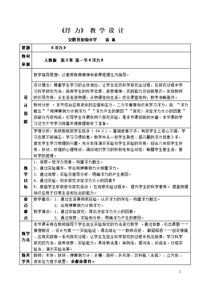 汉阴县初级中学:人教版《10.1浮力》PPT课件+教案