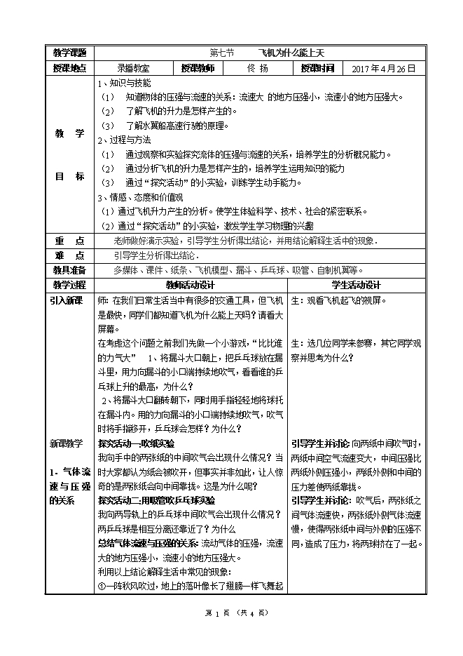 - 16302020年春北师大版八年级下册物理教案:8.7 飞机为什么能上天(附当堂检测题及备课参考资料)