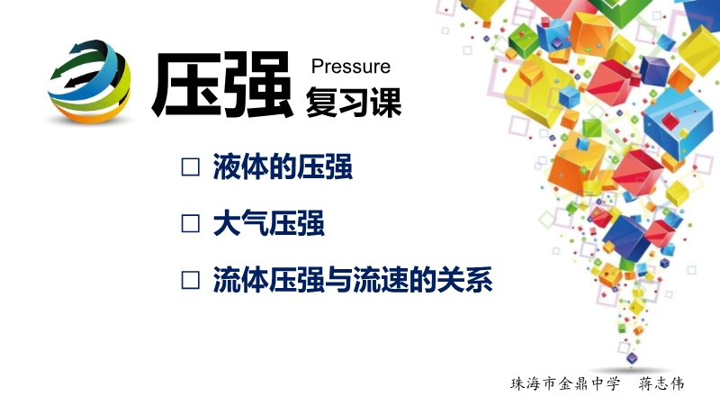 【内容简介】教科版八年级下册《第九章 压强》PPT本章复习。课件共有28张幻灯片,首先对全章知识进行梳理,然后针对压力压强、液体压强、大气压强等知识点进行复习,课件注重实验知识的再现,通过动画演示实验过程.