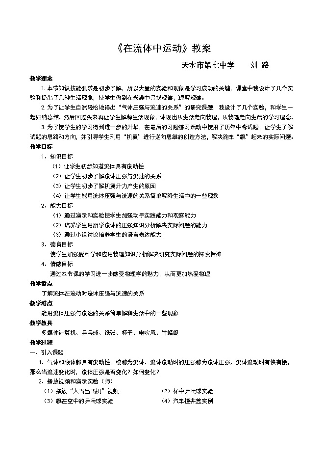 天水市第七中学公开课:教科版《10.1在流体中运动》ppt课件+教案+学案