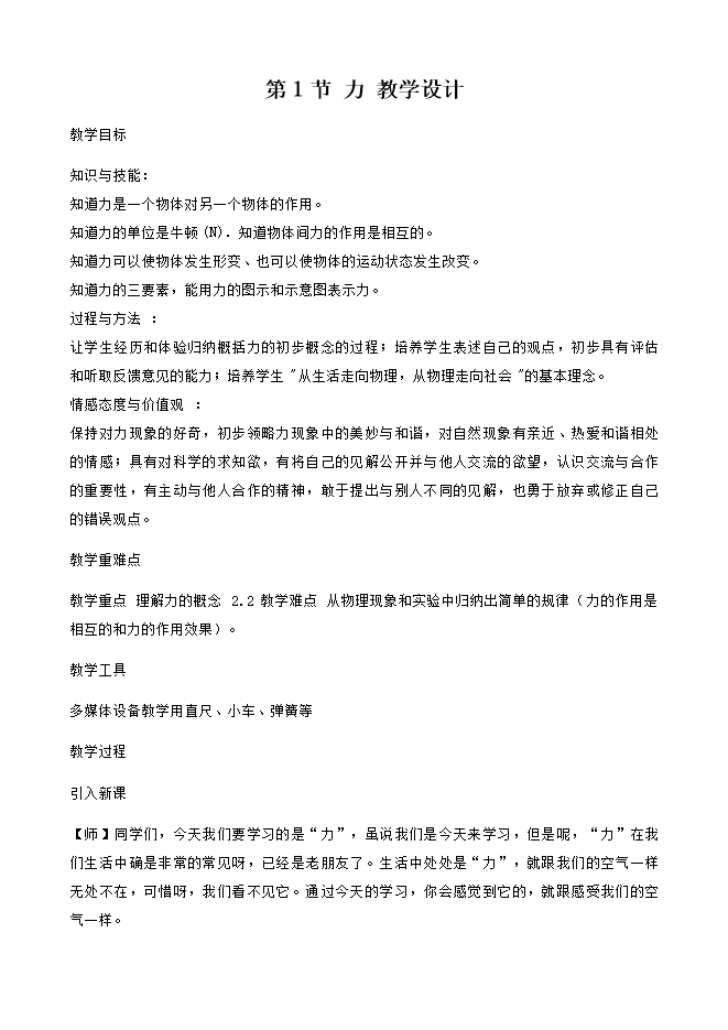 2018-2019人教版八年级物理下册《7.1力》教学设计2