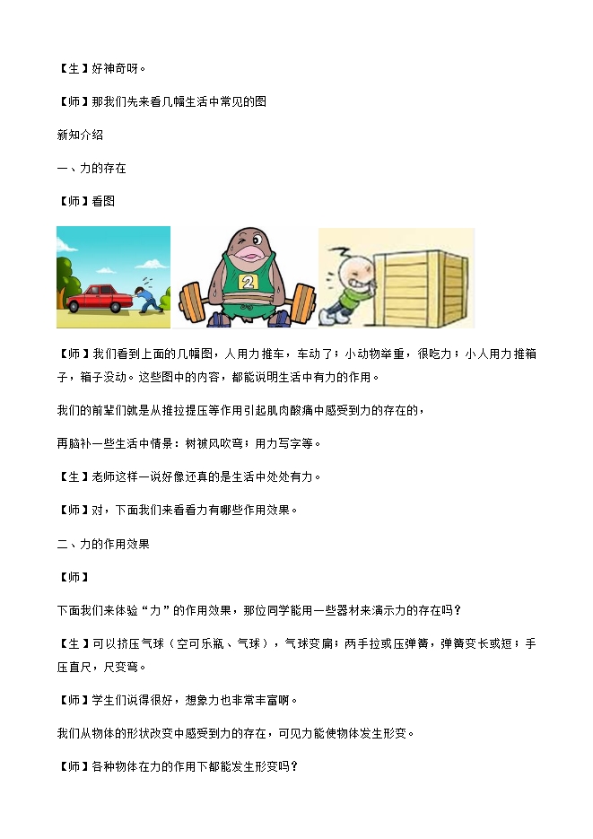 【师】我们看到上面的几幅图,人用力推车,车动了;小动物举重,很吃力;小人用力推箱子,箱子没动。这些图中的内容,都能说明生活中有力的作用。
