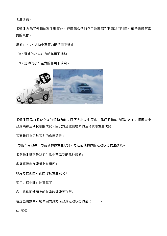 【师】可见力能使物体的运动方向、速度大小发生变化,我们把物体的运动方向,速度大小改变统称运动状态的改变。因此力还能使物体的运动状态发生改变。
