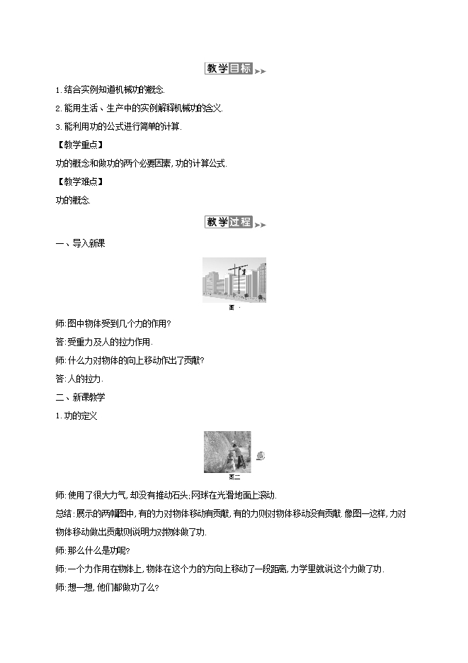 1.功的初步概念:如果一个力作用在物体上,物体在这个力的方向上移动了一段距离,就说这个力做了功.