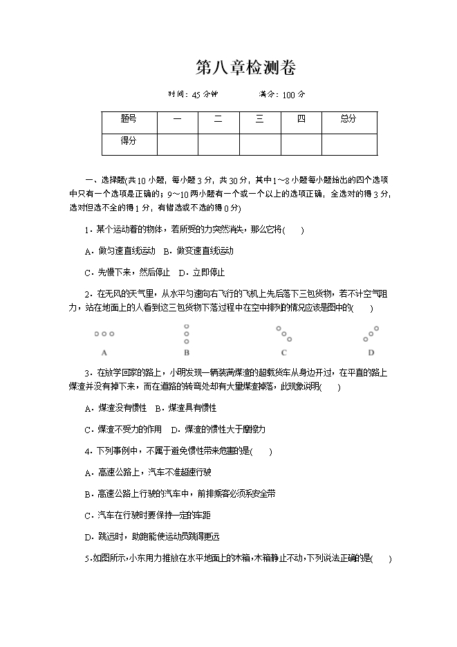 2019春教科版八年级下册物理《第八章 力与运动》单元检测卷及答案