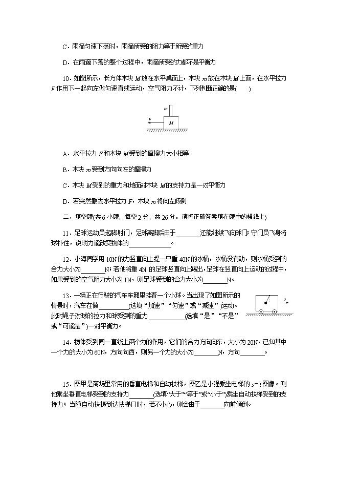 12.小海同学用10N的力竖直向上提一只重40N的水桶,水桶没有动,则水桶受到的合力大小为________N;若他将重4N 的足球竖直向上踢出,足球在竖直向上运动的过程中,如果受到的空气阻力大小为1N,则足球受到的合力大小为________N。