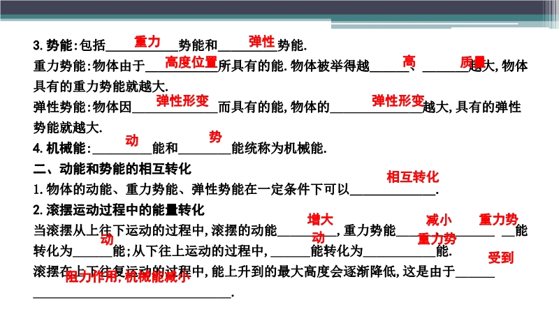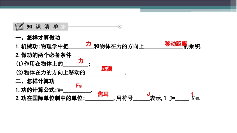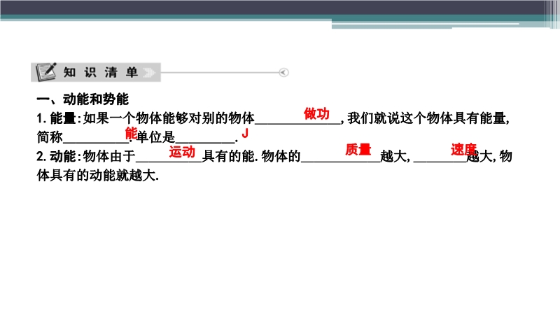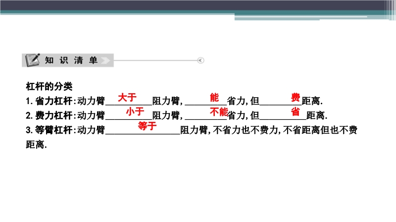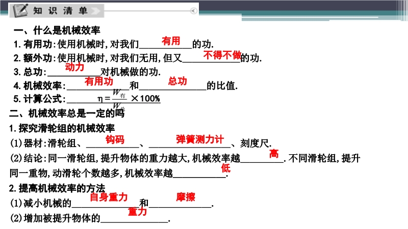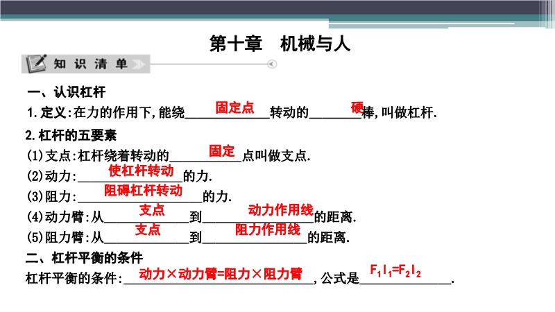 【内容简介】沪科版《第十章 机械与人》复习课件,共有11张幻灯片,课件引导学生复习了杠杆的概念、杠杆的平衡条件、滑轮及滑轮的应用、功的概念、单位和计算、功率的意义、概念、单位和计算,动能和势能的概念、机械能的概念等。通过讲练手段总结方法提高能力等。