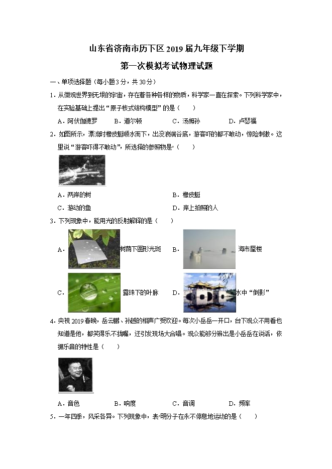 山东省济南市历下区2019届九年级下学期第一次模拟考试物理试题(解析版)