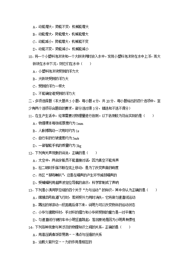 - 1112020-2021年山东省济南市高新区物理八年级第二学期期末试卷(word版,含答案)