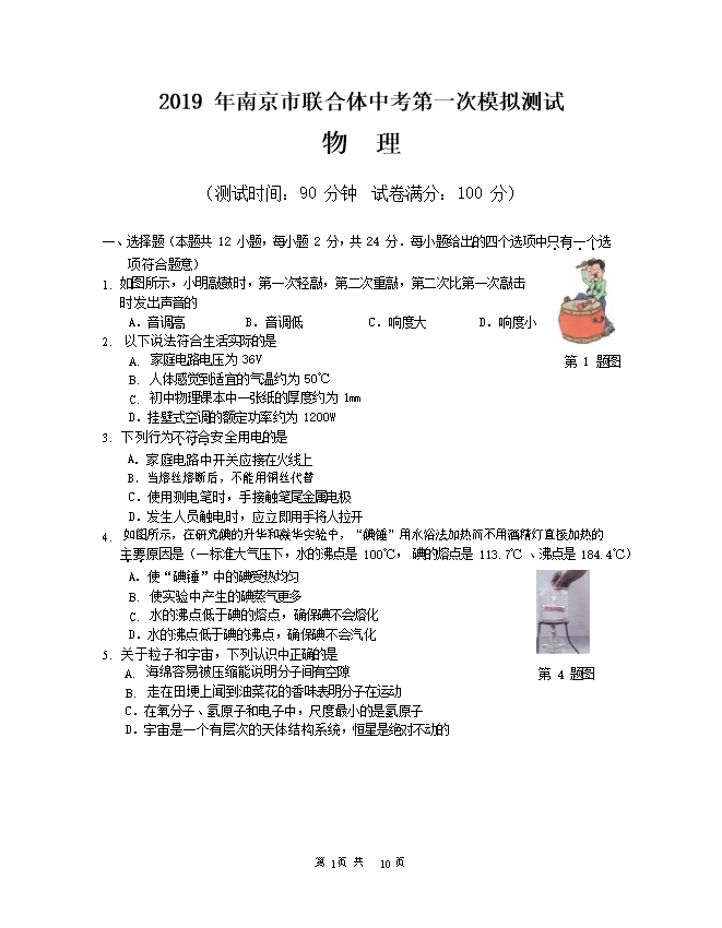 2019年南京市江宁区九年级物理第一次模拟试题及答案