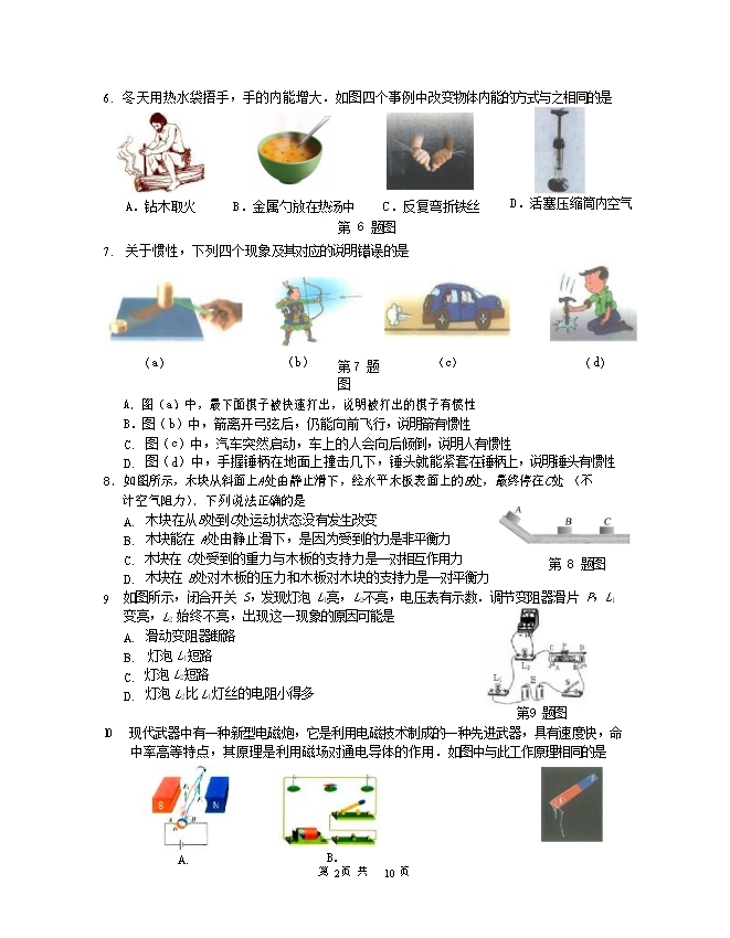 6. 冬天用热水袋捂手,手的内能增大.如图四个事例中改变物体内能的方式与之相同的是