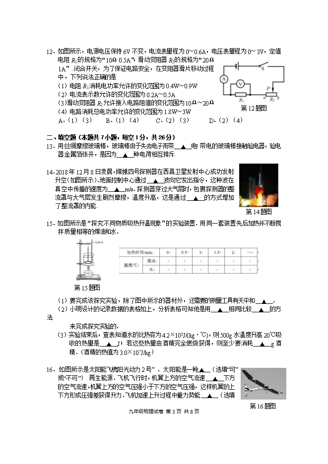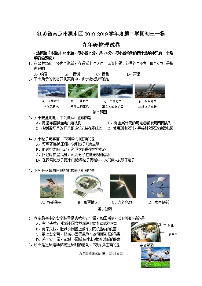 江苏省南京市溧水区2018-2019学年度第二学期初三一模物理试卷(含答案)