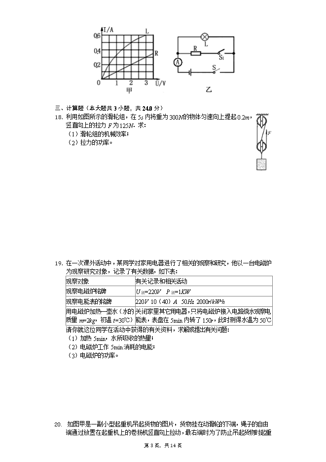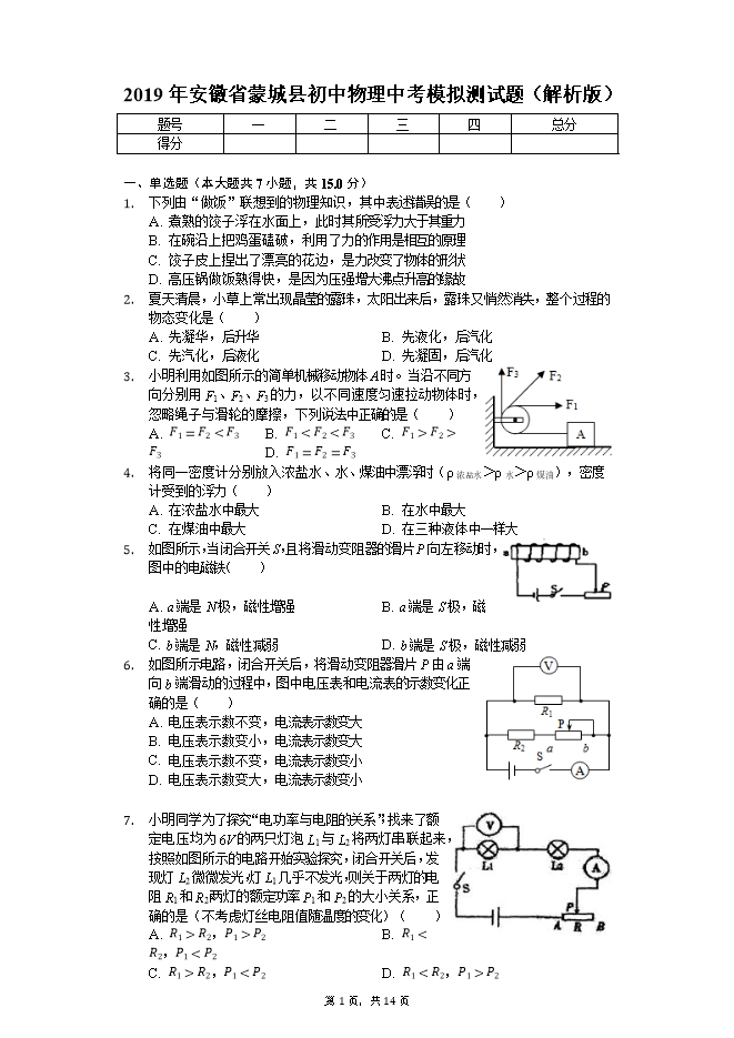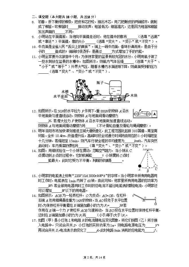 【内容简介】一、单选题(本大题共7小题,共15.0分) 1.         下列由“做饭”联想到的物理知识,其中表述错误的是(  ) A. 煮熟的饺子浮在水面上,此时其所受浮力大于其重力 B. 在碗沿上把鸡蛋磕破,利用了力的作用是相互的原理 C. 饺子皮上捏出了漂亮的花边,是力改变了物体的形状 D. 高压锅做饭熟得快,是因为压强增大沸点升高的缘故 2.         夏天清晨,小草上常出现晶莹的露珠,太阳出来后,露珠又悄然消失,整个过程的物态变化是(  ) A. 先凝华,后升华                                            B. 先液化,后汽化 C. 先汽化,后液化                                            D. 先凝固,后汽化 3.         小明利用如图所示的简单机械移动物体A时。当沿不同方向分别用F1、F2、F3的力,以不同速度匀速拉动物体时,忽略绳子与滑轮的摩擦,下列说法中正确的是(  ) A.          B.          C.          D. 4.         将同一密度计分别放入浓盐水、水、煤油中漂浮时(ρ浓盐水>ρ水>ρ煤油),密度计受到的浮力(  ) A. 在浓盐水中最大                                            B. 在水中最大 C. 在煤油中最大                                                 D. 在三种液体中一样大 5.         如图所示,当闭合开关S,且将滑动变阻器的滑片P 向左移动时,图中的电磁铁(  ) A. a端是N极,磁性增强                                B. a 端是S 极,磁性增强 C. b 端是N,磁性减弱                                     D. b 端是S 极,磁性减弱 6.         如图所示电路,闭合开关后,将滑动变阻器滑片P由a端向b端滑动的过程中,图中电压表和电流表的示数变化正确的是(  ) A. 电压表示数不变,电流表示数变大 B. 电压表示数变小,电流表示数变大 C. 电压表示数不变,电流表示数变小 D. 电压表示数变大,电流表示数变小     7.         小明同学为了探究“电功率与电阻的关系”,找来了额定电压均为6V的两只灯泡L1与L2将两灯串联起来,按照如图所示的电路开始实验探究,闭合开关后,发现灯L2微微发光,灯L1几乎不发光,则关于两灯的电阻R1和R2、两灯的额定功率P1和P2的大小关系,正确的是(不考虑灯丝电阻值随温度的变化)(  ) A. ,                                         B. , C. ,                                         D. , 二、填空题(本大题共10小题,共22.0分) 8.         初春,折下嫩绿的柳条,把皮和芯拧松,抽出木芯,用刀把嫩皮的两端修齐,就制成了柳笛。吹柳笛时______振动发声,粗笛低沉,细笛高亢,这是因为粗笛和细笛发出声音的______不同。 9.         小明站在平面镜前,当他向平面镜走近时,他在镜中的像将______(选填“远离”或“靠近”)平面镜,像的大小______(选填“变大”、“变小”或“不变”)。 10.     牛肉面是全省人民“舌尖上的美食”。端上一碗牛肉面,香味扑鼻而来,是由于分子的______造成的;端碗时很烫手,是通过______方式增加了手的内能。 11.     小明全家要外出旅游半个月,为保持家里的盆景有较充足的水分,小明用瓶子装了一些水倒放在盆景的水槽中,如图所示,则瓶内气体压强______(选填“大于”、“小于”或“等于”)外界大气压.随着水槽内水面逐渐下降,则桌面受到的压力______(选填“变大”、“变小”或“不变”).     12.     如图所示,在50N的水平拉力F作用下,重800N的物体A沿水平地面做匀速直线运动,则物体A与地面间滑动摩擦力______N.若增大拉力F使物体A沿水平地面做加速直线运动,则物体A与地面间滑动摩擦力将______(不计滑轮自重及滑轮与绳间摩擦)。 13.     明年洛阳市将加快谋划推进王城大道快速化,此工程范围北起新310国道、南至南环路,全长18.4km.改造提升后,高峰时段全线通行时间将由现在的1小时缩短至十几分钟,若缩短至15min,则汽车行驶全程的平均速度为______km/h.汽车突然启动时,车内乘客的惯性将______(填“变大”、“变小”或“不变”)。 如图,用细线拴住一个小球在摆动,忽略空气阻力,当小球从C点摆动到B点的过程中,它的机械能______;小球摆到C点时______能最大,此时它受力不平衡,判断的依据是______。