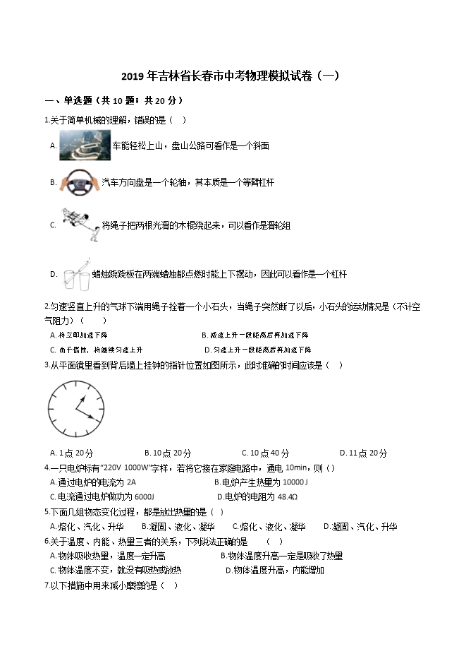 2019年吉林省长春市中考物理模拟试卷(一)(附答案)