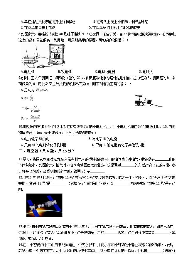 8.如图所示,用棉线将铜棒ab悬挂于磁铁N、S极之间.闭合开关,当ab做切割磁感线运动时,观察到电流表的指针发生偏转.利用这一现象所揭示的原理,可制成的设备是( )