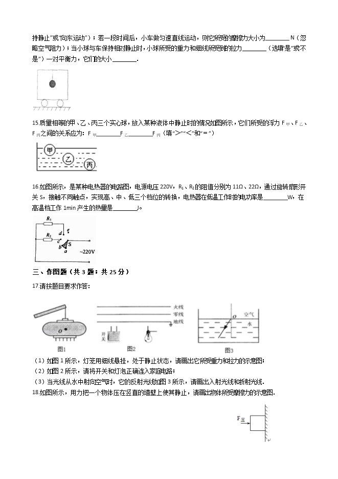 14.在一个密闭的小车中用细线固定住一个实心小球,并使小车和小球均处于静止状态(如图所示).此时,若给小车一个方向向东,大小为10N的力使小车运动,则小车在运动的一瞬间,小球将________(选填“保持静止”或“向东运动”);若一段时间后,小车做匀速直线运动,则它所受的摩擦力大小为________ N(忽略空气阻力);当小球与车保持相对静止时,小球所受的重力和细线所受到的拉力________(选填“是”或“不是”)一对平衡力,它们的大小________.