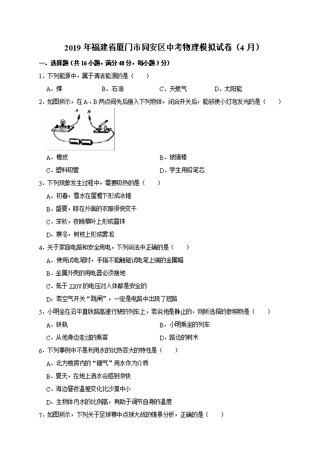 2019年福建省厦门市同安区中考物理模拟试卷(4月)(解析版)
