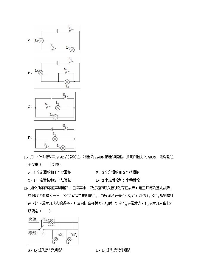 D、空气开关“跳闸”,说明电路电流太大,原因是电路中出现了短路或用电器的总功率过大。故D错误。