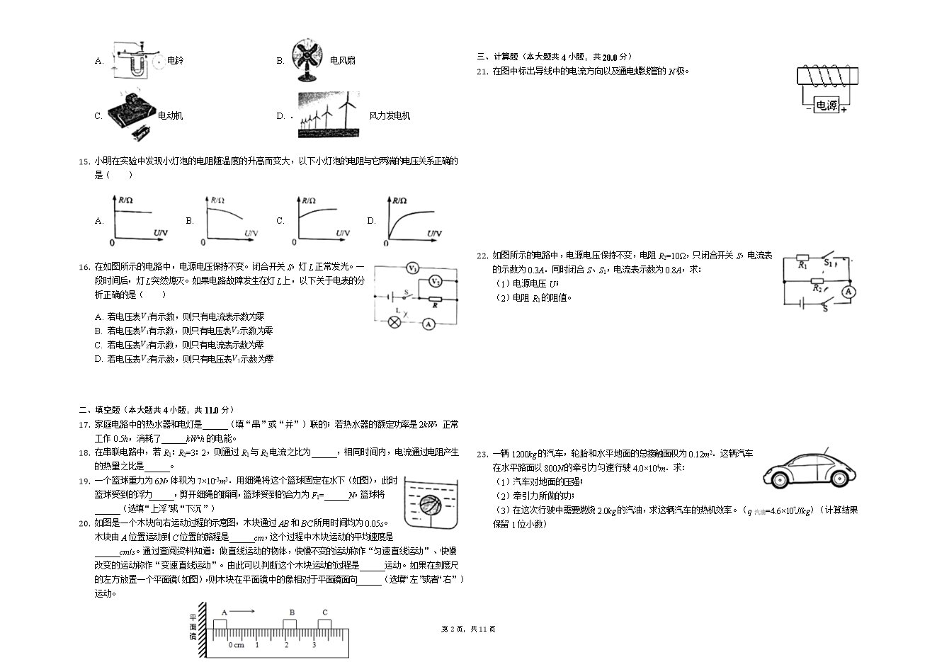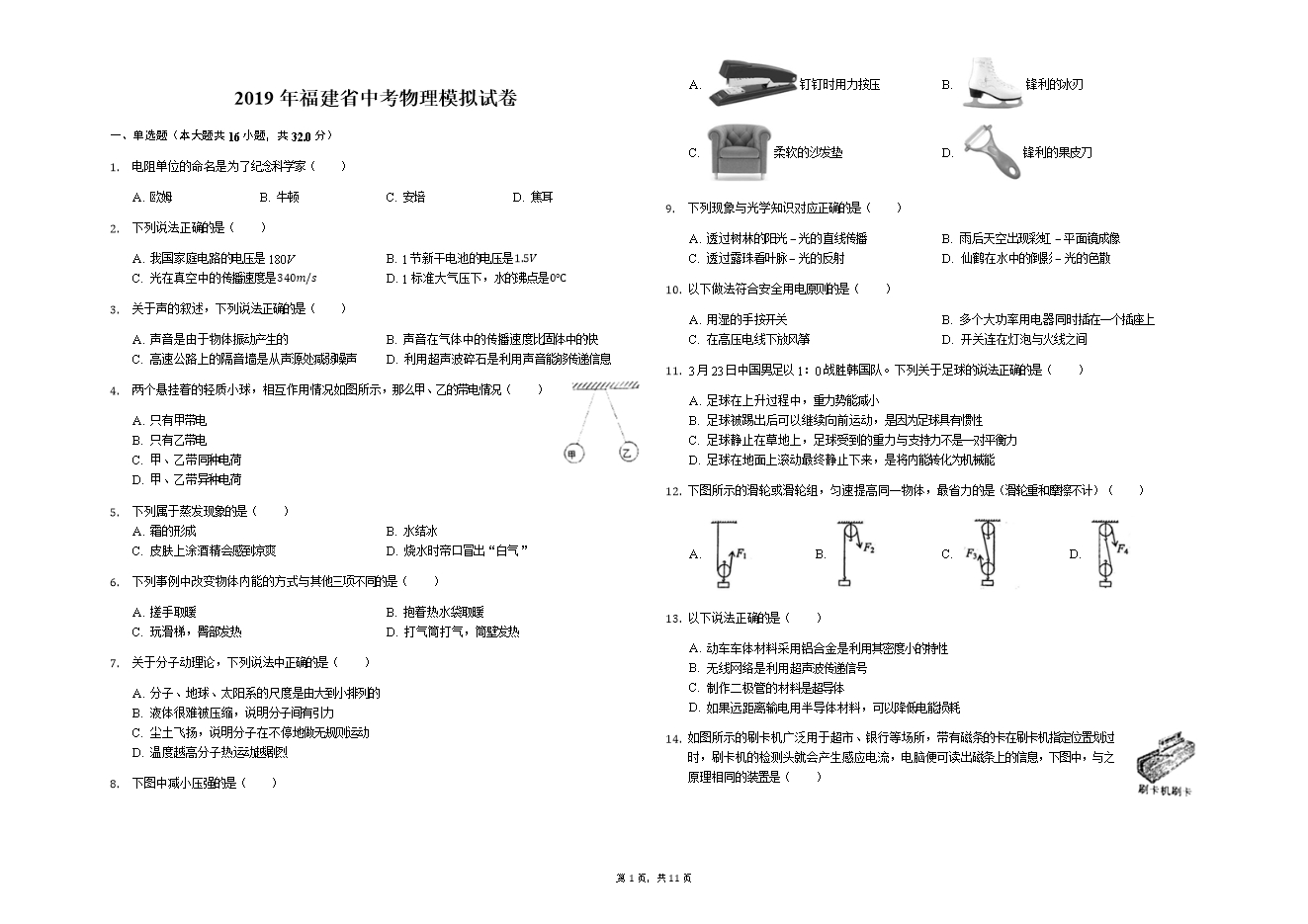 14. 如图所示的刷卡机广泛用于超市、银行等场所,带有磁条的卡在刷卡机指定位置划过时,刷卡机的检测头就会产生感应电流,电脑便可读出磁条上的信息,下图中,与之原理相同的装置是( )