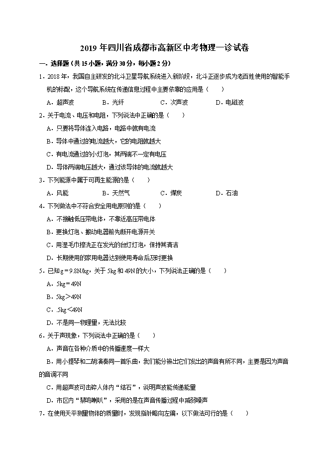 2019年四川省成都市高新区中考物理一诊试卷(解析版)