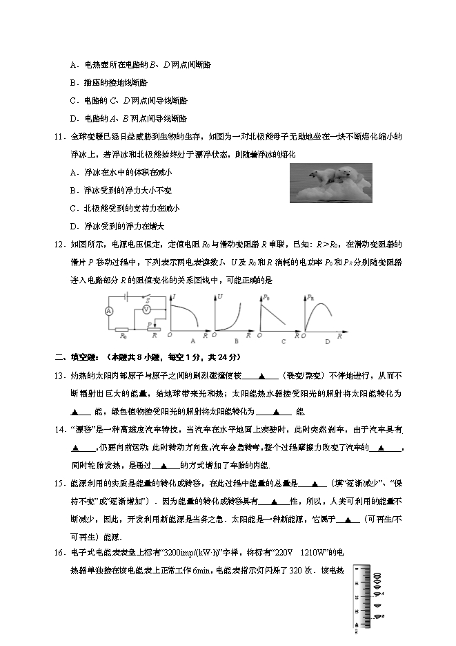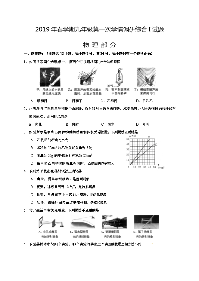 江苏省阜宁县2019届九年级下学期第一次学情调研物理试题及答案