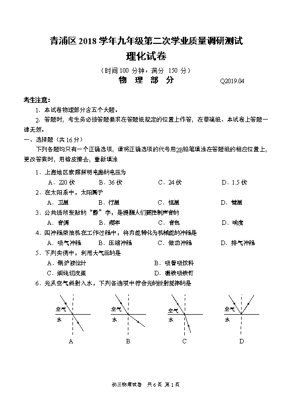 上海市青浦区2018学年九年级第二次学业质量调研测试二模试卷(Word版有答案)